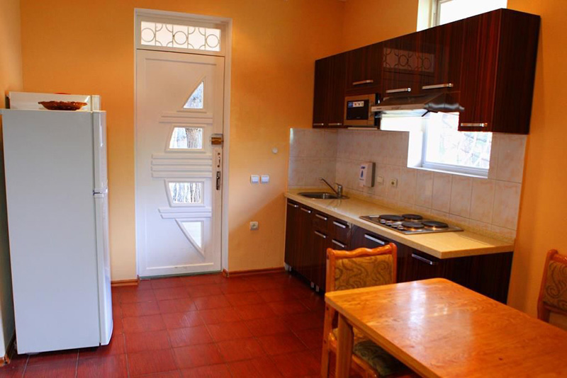 Для этого в коттеджах имеется оборудованная кухня с холодильником, микроволновой печью, электроплитой, набором посуды